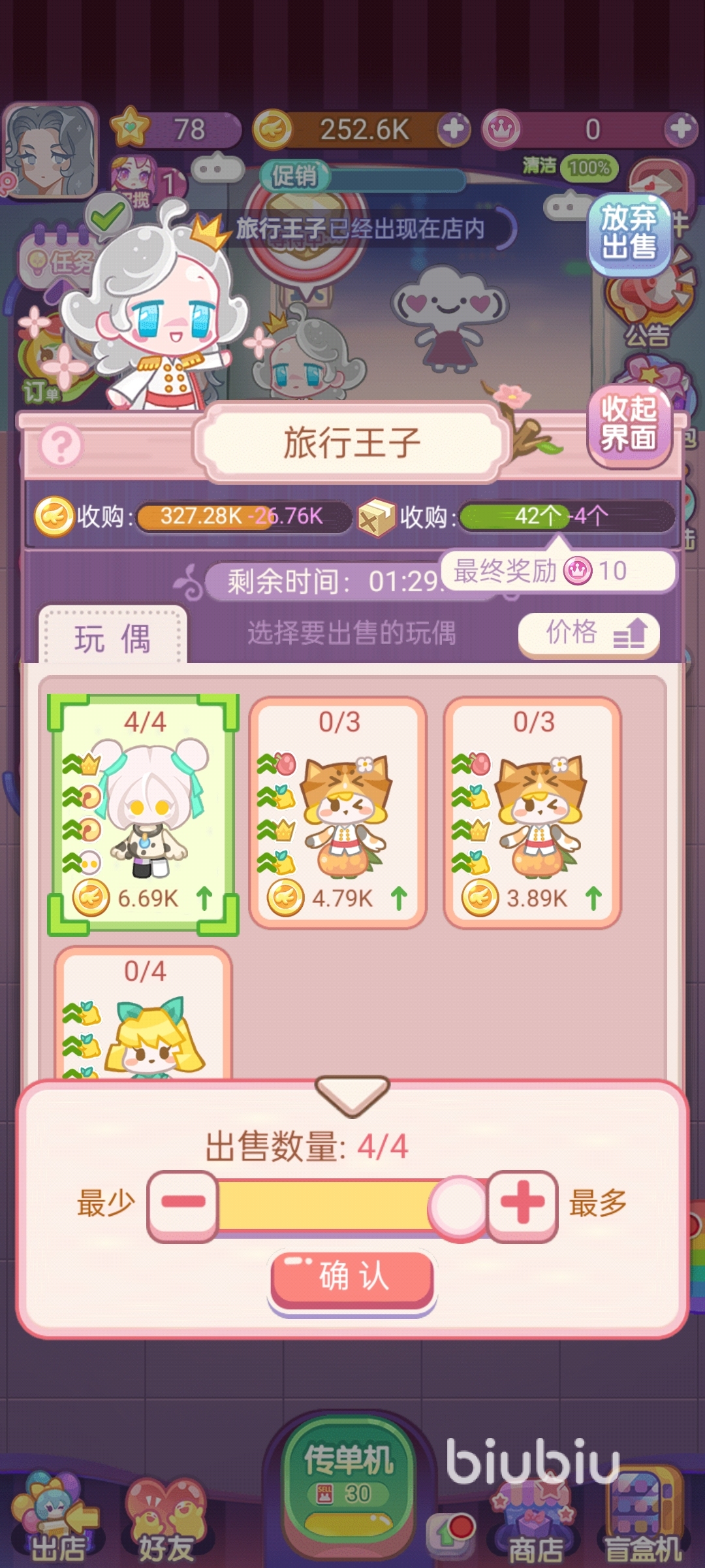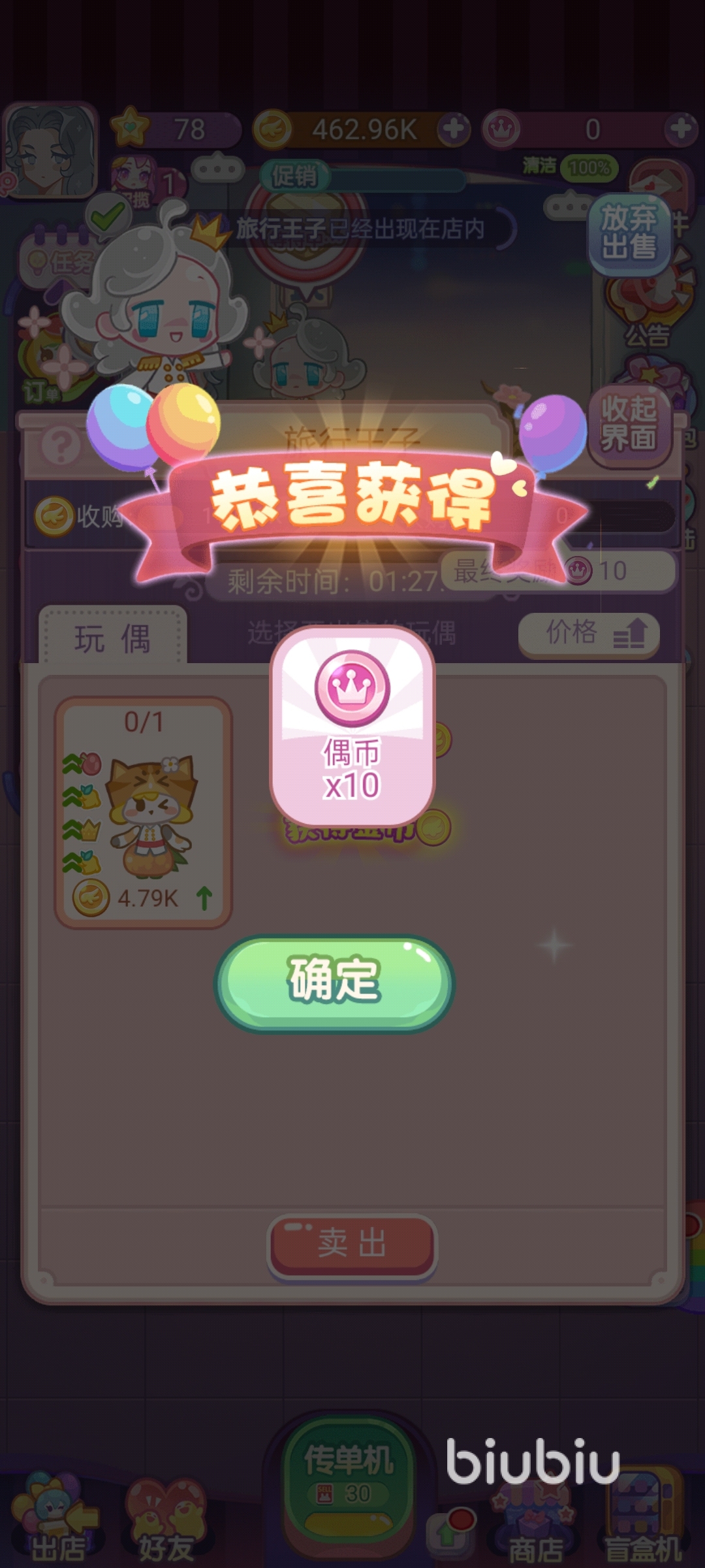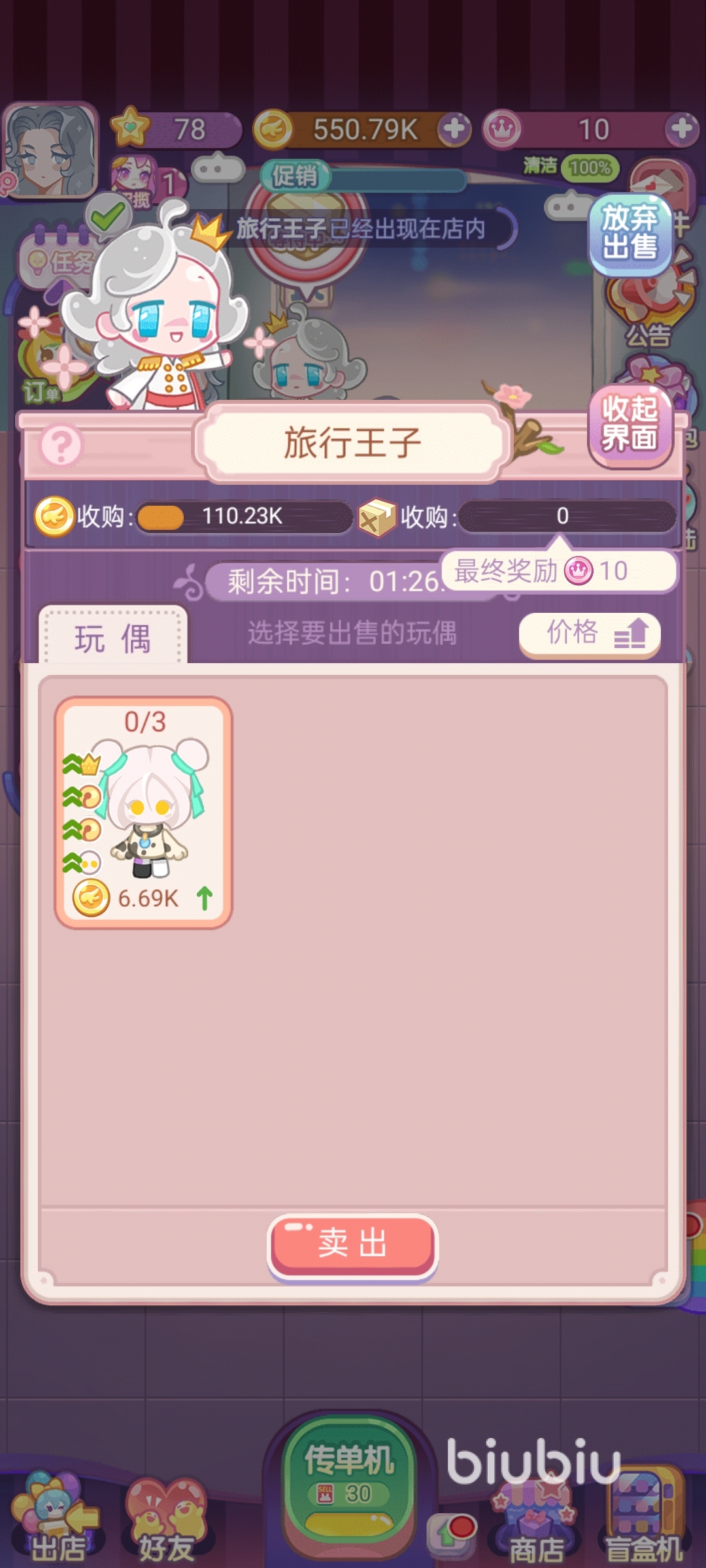出售玩偶給旅行王子主要能獲取到金幣,但是也能獲取到少許的偶幣,偶幣是十分珍貴的貨幣,能夠購買自動補貨和自動加速的能量值,所以每天的旅行王子是不能錯過的。