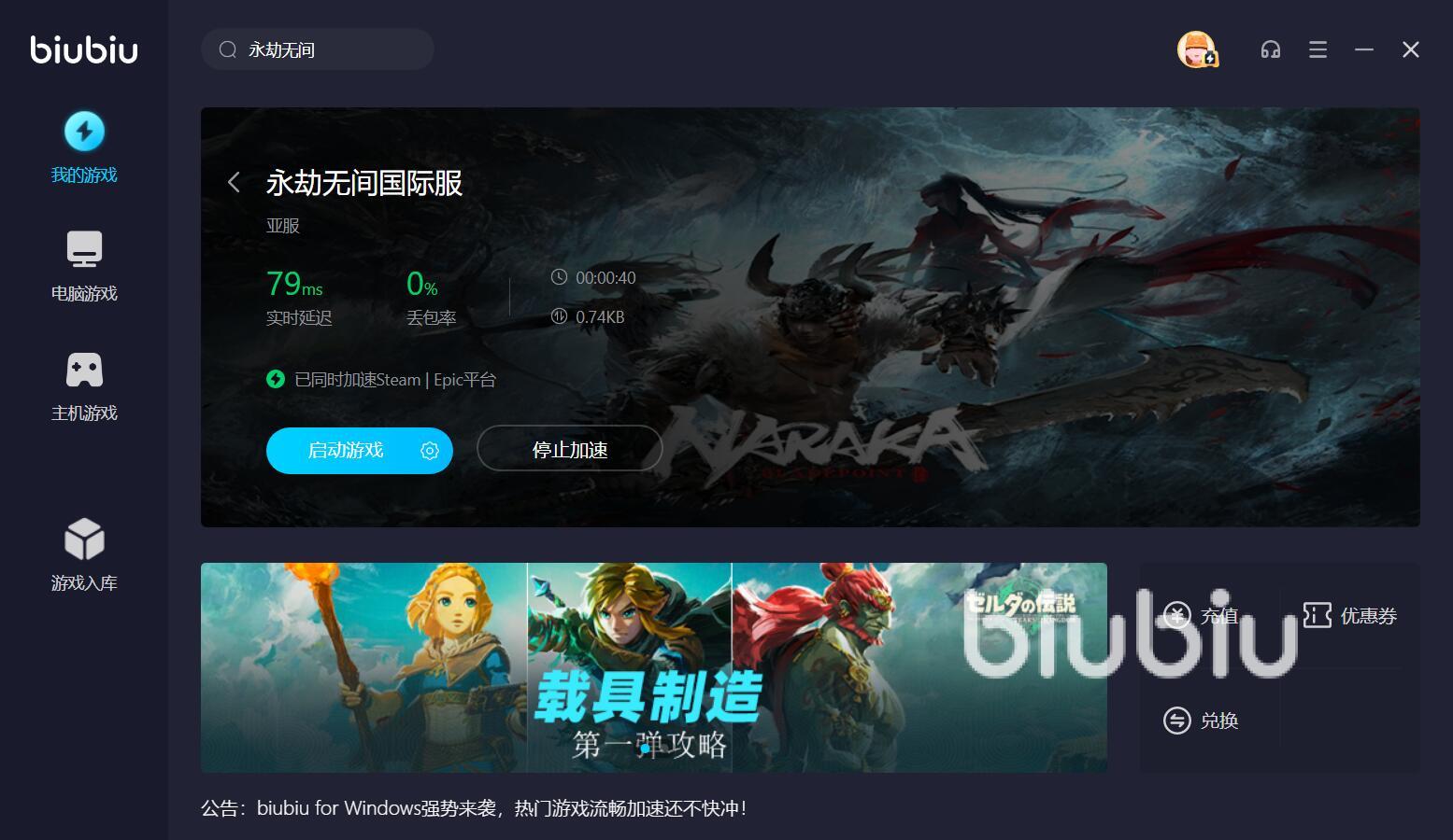 Biubiu在操作上非常簡(jiǎn)單,只需要通過游戲庫(kù)查找到永劫無間,然后點(diǎn)擊加速就能直接開啟客戶端進(jìn)入其中。后續(xù)不需要大家再進(jìn)行任何操作,軟件會(huì)自動(dòng)在后臺(tái)運(yùn)行,通過自己獨(dú)特的加速技術(shù)將延遲穩(wěn)定到正常水準(zhǔn)。自然就避免出現(xiàn)卡頓的問題。只需要成功加速一次,后續(xù)就能在軟件中直接查看到,不需要再次尋找。雖然需要付費(fèi)成為會(huì)員后才能享受到全部加速服務(wù),但是新用戶有24小時(shí)免費(fèi)體驗(yàn)機(jī),第1次充值還有優(yōu)惠折扣,這些都是很好的福利。