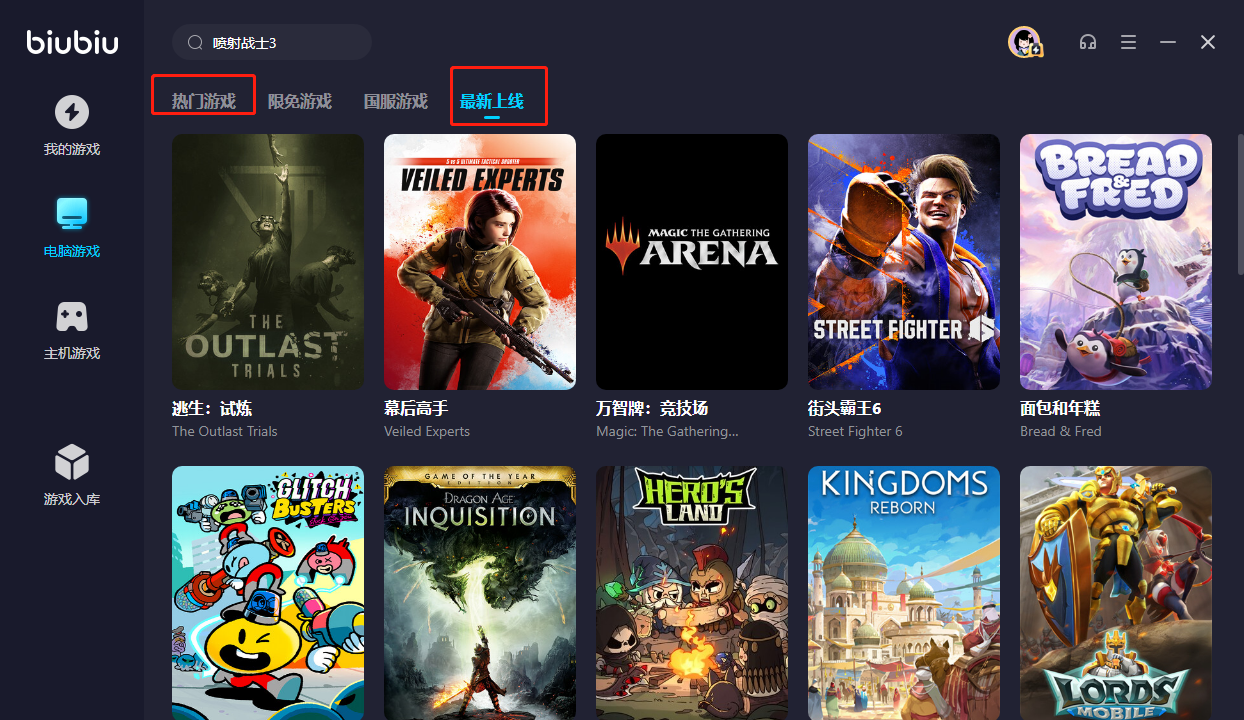 要是現(xiàn)在手頭的游戲玩夠了怎么辦?Biubiu除了純加速之外還能提供熱門游戲的搜索,在主頁面找到“電腦游戲”就能看到它有劃分的三個專區(qū),要想找新游戲玩的話就多關注熱門游戲和最新上線兩個專區(qū),專區(qū)內游戲都是根據(jù)人氣和上線時間來排列,并且只要游戲出現(xiàn)在biubiu內就代表也能去加速,所以能看出它對新游戲的關注程度很高,而且加速器適用范圍特別大,就算新游戲也能快速解決卡頓問題推出加速服務。