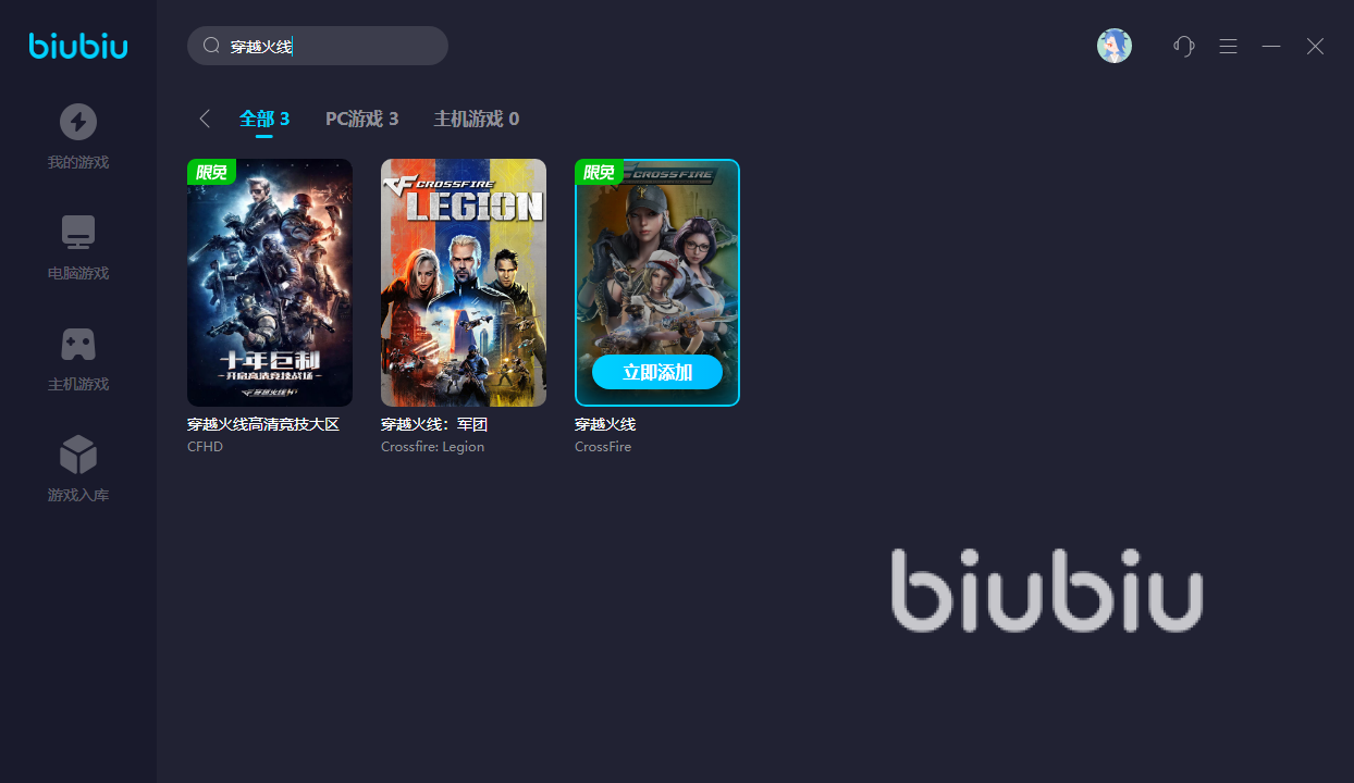 那怎么用biubiu給穿越火線游戲防護,避免游戲卡頓呢?很簡單,穿越火線的玩家直接搜索biubiu下載安裝好后,在biubiu平臺上搜索穿越火線游戲添加到自己的游戲庫就好了。后面就不需要做什么了,只有當穿越火線的小伙伴們想玩游戲的時候再打開就行了。