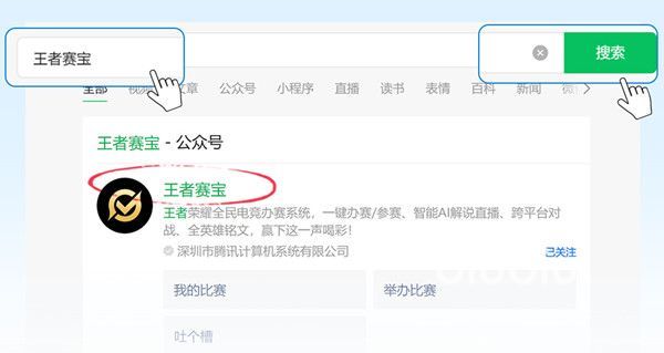 王者賽寶系統(tǒng)使用十分便利,不需要用戶下載APP,若想要使用王者賽寶系統(tǒng),玩家可以通過打開微信、QQ、王者營地,然后在搜索框內(nèi)輸入【王者賽寶】,點擊搜索后就可以找到官方的公眾號隨時啟用了。
