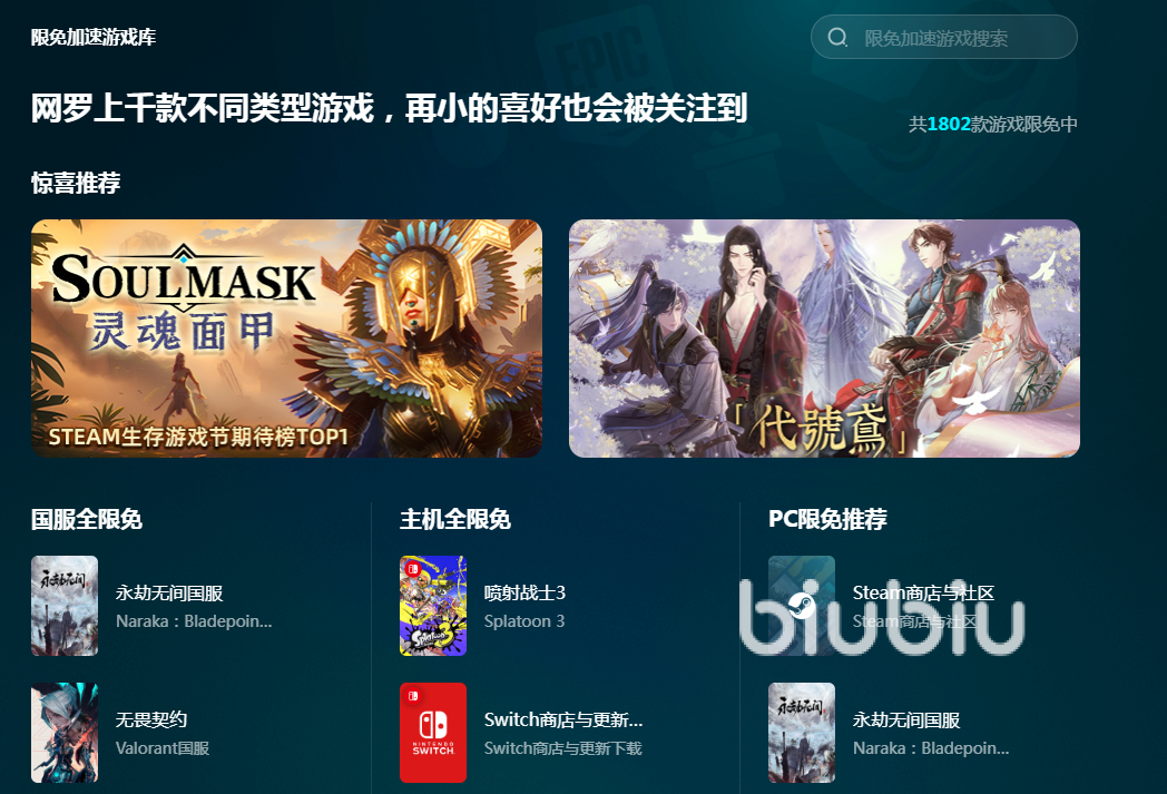 大家喜歡的游戲特別多,不會(huì)只盯著一款游戲來玩,不管大家玩什么類型的游戲、玩什么端口的游戲,都可以用biubiu加速。biubiu平臺(tái)里有非常多的游戲,大家想玩什么都能直接加速,并且它還能加速游戲平臺(tái),網(wǎng)速同步到平臺(tái)上以后大家在steam里面也能流暢的打開游戲來玩。