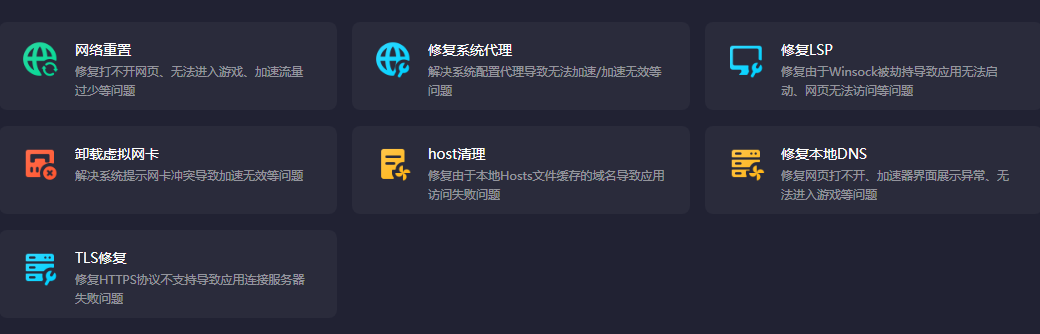 它的工具箱使用方法就更簡單了,在軟件右上角找到工具箱以后點(diǎn)進(jìn)去,就能看到各式各樣的工具,它們能夠修復(fù)因系統(tǒng)代理、LSP故障、TLS故障導(dǎo)致的加速無效,還能清理本地host,優(yōu)化完畢以后游戲運(yùn)行更加流暢,自然也不擔(dān)心有延遲了。