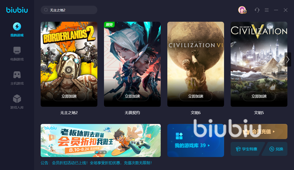 無主之地2在PC端是在steam里購買和游玩的,而biubiu加速器目前正好可以限時免費(fèi)加速steam里的游戲,新用戶更是暢享24小時免費(fèi)加速,還有國服游戲也是限時免費(fèi)加速的,這基本囊括了很多玩家日常游玩的游戲,可以讓大家體驗感提升的同時還不用花錢,福利和誠意直接拉滿了有木有。