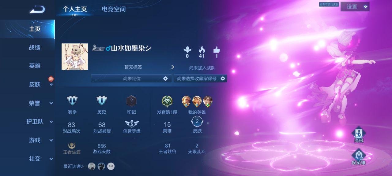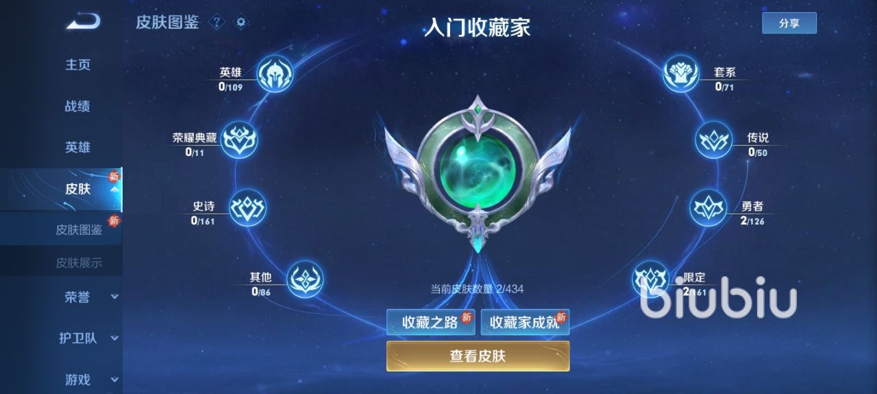 這里給你們詳細介紹一下,第一步先進入游戲主頁面,第二步點擊你的個人頭像,此時你們將看見自己的全部信息,第三步在左邊一欄中找到皮膚這個選擇并點擊,此時下面會出現皮膚圖簽和皮膚展示。
