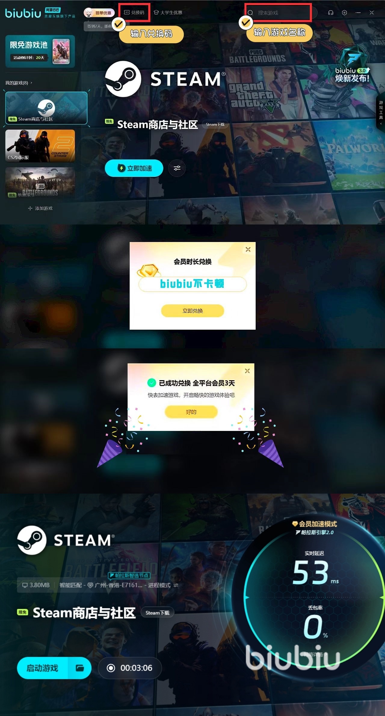 而且玩家們應該都知道Steam作為一個熱門的平臺,里面也是擁有非常多的玩家,而且超多游戲也是跨區(qū)服的,如果不借助加速器的幫助,那么就很難順利連接,這個時候小編就比較推薦大家下載biubiu。現(xiàn)在新用戶是可以直接免費使用24小時的。如果覺得這些時間不夠大家了解平臺或者是完成下載的,那么玩家們還可以使用【biubiu不卡頓】這一特定暗號口令去參與活動,能夠幫助玩家們直接額外領取到72小時的免費使用機會,這也就意味著新用戶是可以擁有更充足的體驗時間,去對自己喜愛的游戲進行加速處理。同時在下載過程中,它也能幫助我們最大限度縮短下載的時間,讓網(wǎng)絡變得更流暢,而且進入游戲也會更加順利。