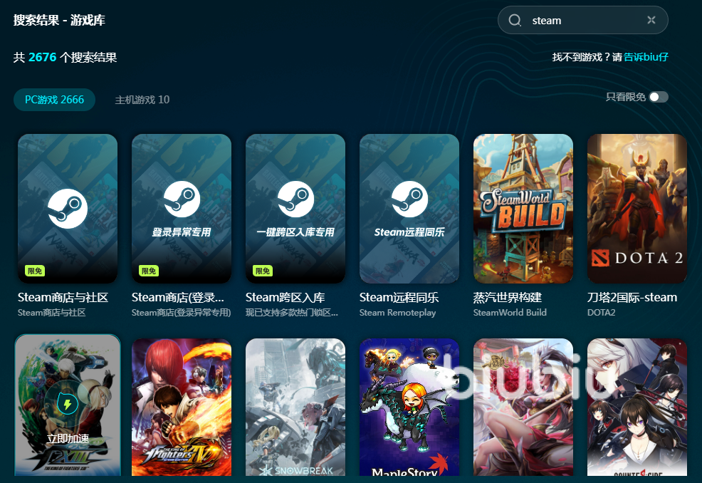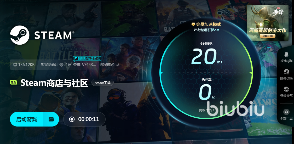 加速器當然是biubiu給力了,光是新用戶免費24小時加速體驗就體現了它的誠意,除此之外新老用戶還能通過?【biubiu不卡頓】兌換到3天免費加速。全球游戲都在它的加速范圍里面,游戲庫里的資源應有盡有,現在開放steam商店社區(qū)、跨區(qū)入庫免費加速,機不可失趕緊來體驗。