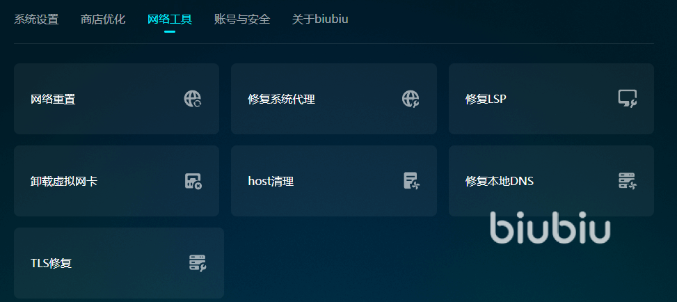 除了新用戶專屬福利外,biubiu還給全體用戶贈(zèng)送3天免費(fèi)加速,只要使用【biubiu不卡頓】即可。游戲閃退很有可能是電腦網(wǎng)絡(luò)有故障,可以先在biubiu里找到工具修復(fù)這些故障,它的工具箱針對(duì)TLS修復(fù)、DNS修復(fù)、網(wǎng)卡修復(fù)都很有效,還有商店優(yōu)化功能來(lái)修復(fù)Epic、Steam等游戲平臺(tái)登錄報(bào)錯(cuò)。