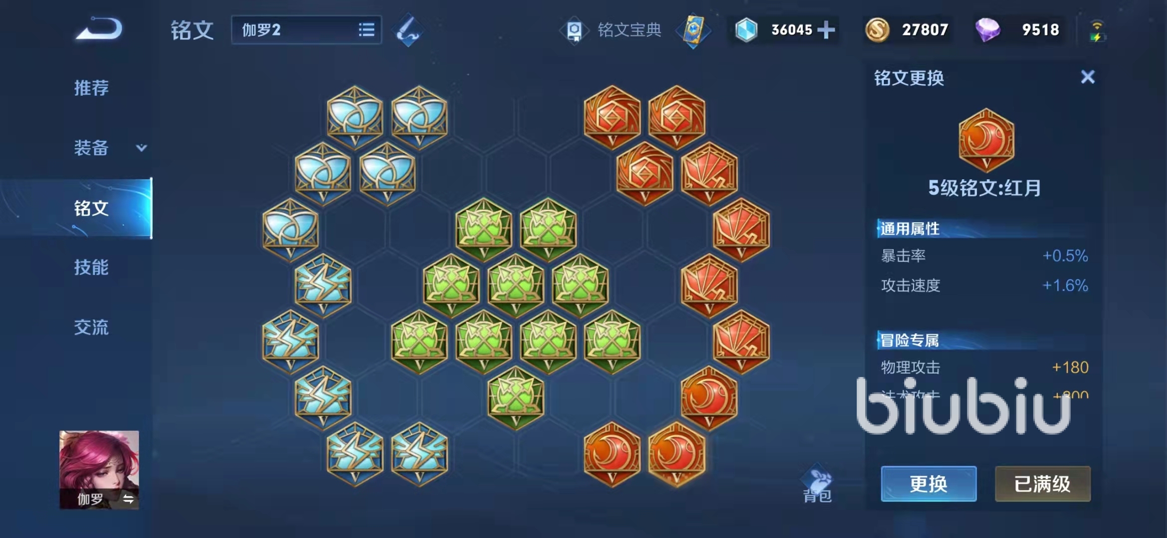 伽羅的藍色銘文建議全部都帶奪萃,能夠增加大量的物理吸血能力,補充它的吸血效果。綠色銘文的話,全部帶鷹眼,可以增加物理攻擊以及物理穿透,進一步提升傷害。至于紅色銘文的話,帶三個無雙,增加暴擊率以及暴擊傷害。接著再帶四個禍源,增加暴擊率。最后再帶三個紅月增加暴擊率以及攻速。