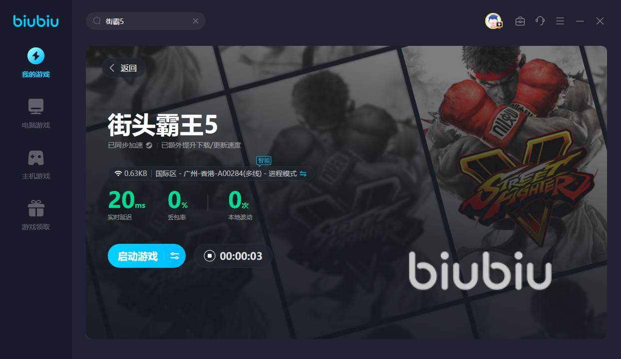 由于街霸五暫且木有國(guó)服,所以為了進(jìn)入游戲頁(yè)面,還得利用biubiu加速器。用起來(lái)也很簡(jiǎn)單,僅需一鍵即可設(shè)置好對(duì)應(yīng)的網(wǎng)絡(luò)節(jié)點(diǎn)。若是玩了幾把想要休息一下的話,即可點(diǎn)擊一下暫停,便可為其他游戲加速,非常容易!如果是新用戶的話,還能獲得24H的免費(fèi)加速,無(wú)償感受一下這種加速快感!新老用戶還可輸入【biubiu不卡頓】,就能繼續(xù)享受三天免費(fèi)加速,讓你玩得樂(lè)此不疲,從此愛(ài)上biubiu!