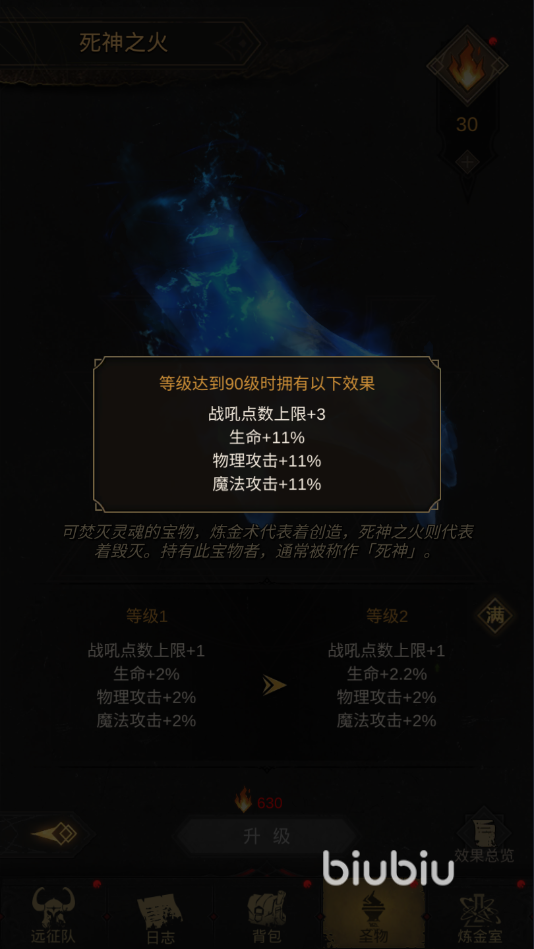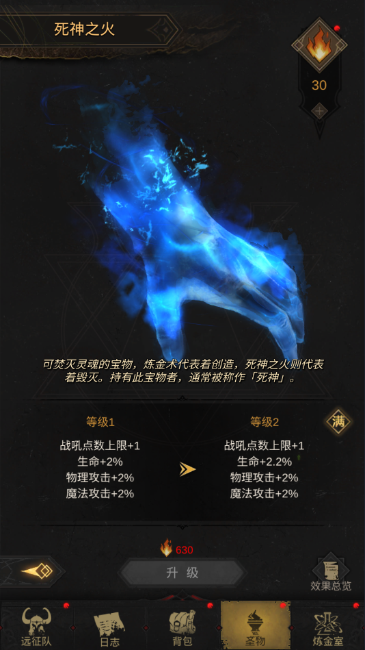 2、圣物強化:圣物強化是需要消耗“火”的,圣物的等級越高強化時消耗的火也就會越多。強化圣物可以帶來大量的屬性提升,這個直接影響到后期游戲的強度。