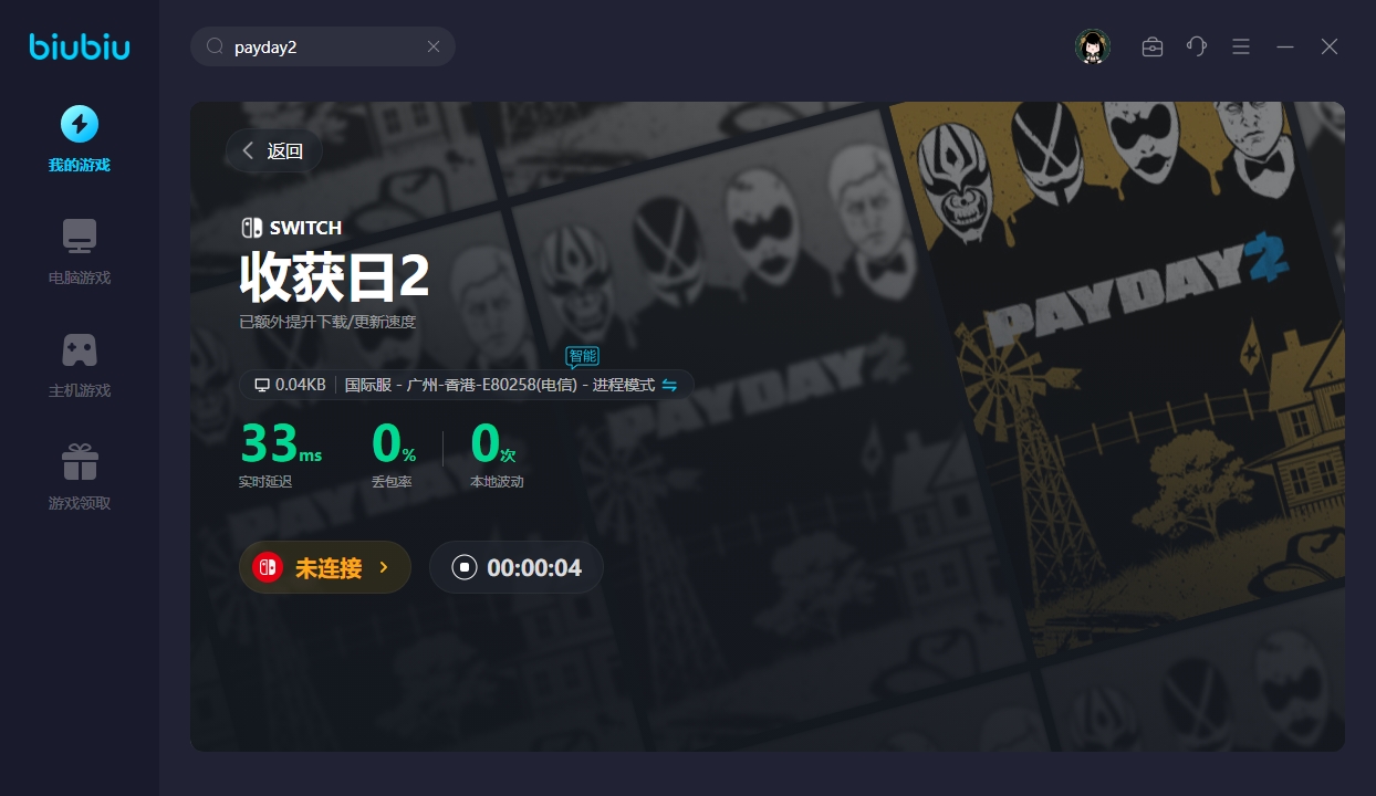 來源: 極光 作者: 果果 2024年03月13日 13:38很多玩家對于這款第一人稱的射擊玩法游戲還是很喜歡的,除了畫面真實以外,它的劇情和城市模擬都是很真實的,這無疑對大家的網(wǎng)絡(luò)是一個巨大的考驗,下面小編就來和大家說下payday2要加速器嗎,在玩家的游戲體驗過程中,如果遇到了延遲很高,或者是經(jīng)常發(fā)生掉線等狀況的話,肯定是得通過加速工具來幫自身進行穩(wěn)定的,其中像biubiu就是個十分合適的選擇,各位若是有想法不如就來看下吧。