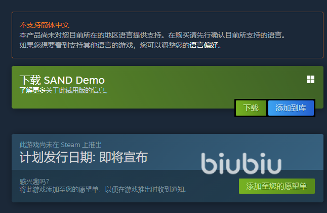 現(xiàn)在大家已經(jīng)可以在steam上面玩到它的試玩版本了,不過它目前還是不支持簡體中文的,所以大家在玩的時候可能會有一點的不適應(yīng),同時游戲暫未公布正式版的上線時間,對此游戲有興趣的朋友可以先將它加入到自己的愿望單里面,這樣后續(xù)關(guān)于它的消息就能第一時間收到了。