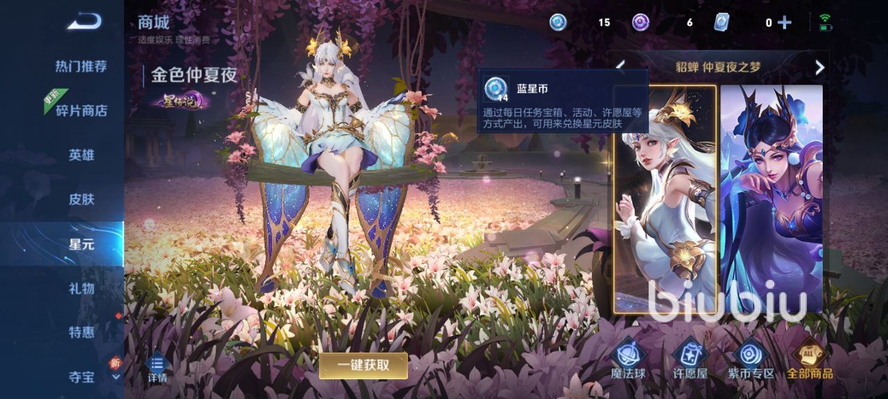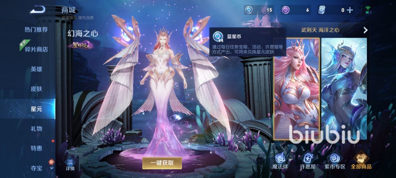 藍星幣在王者榮耀中是一個兌換物品,首先大家需要進入游戲頁面,然后點擊右上角的商城按鈕,在進入這個地方時,你們會看見八個選項,分別是熱門推薦、碎片商店、英雄、皮膚、星元、禮物、特惠、奪寶,大家點擊其中的星元,便會看見藍星幣顯示了出來。