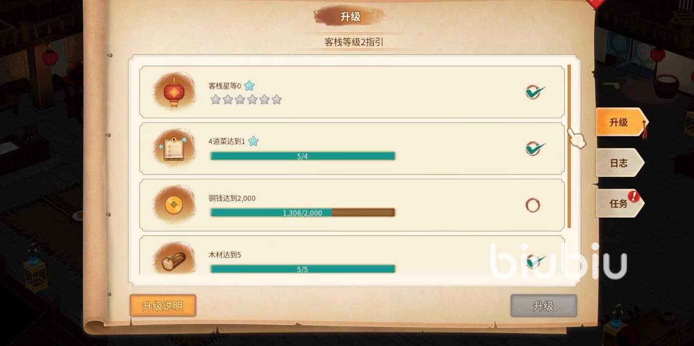 就比如,小伙伴們想要將自己的客棧提升到二級(jí),就需要有四道菜都滿一星才可以,同時(shí)銅錢(qián)要滿兩千,木材只需要五個(gè),這些都一一滿足以后就能完成客棧等級(jí)的提升了。當(dāng)然,如果材料資源不夠的話,其中的木材以及石料就需要前往余杭鎮(zhèn)上的市集購(gòu)買(mǎi)了。而菜品星級(jí)不夠的話,這個(gè)就需要等客棧經(jīng)營(yíng)結(jié)束以后,也就是夜晚的時(shí)候,前往廚房來(lái)提升菜品的星級(jí)了。