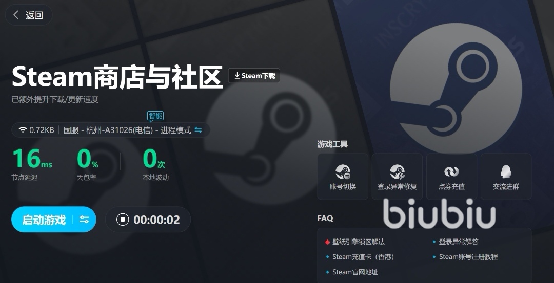 目前,此游戲是可以在Steam平臺(tái)是玩的,因此玩家只要使用用biubiu來(lái)加速Steam就行,值得一提的是,這一加速工具有著眾多功能的,其中一項(xiàng)很重要的功能,就是它可以支持多端游戲加速,無(wú)論是PC端,還是Steam端,都能用它進(jìn)行加速使用,小伙伴們可以親自去體驗(yàn)一下。