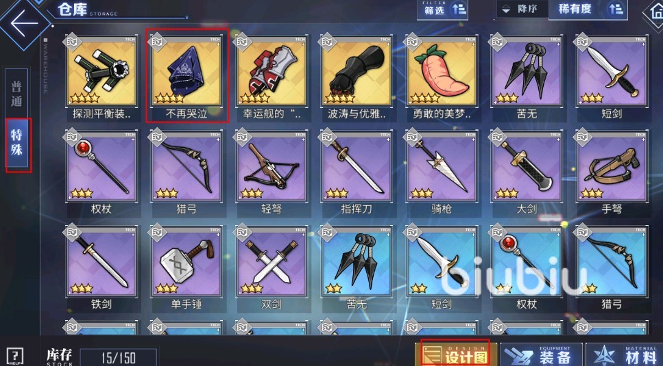 專屬特殊兵裝只能通過設(shè)計圖制作,在游戲的倉庫-設(shè)計圖-特殊頁面中,可以看到SSR金色的專屬特殊兵裝,也就是專武。
