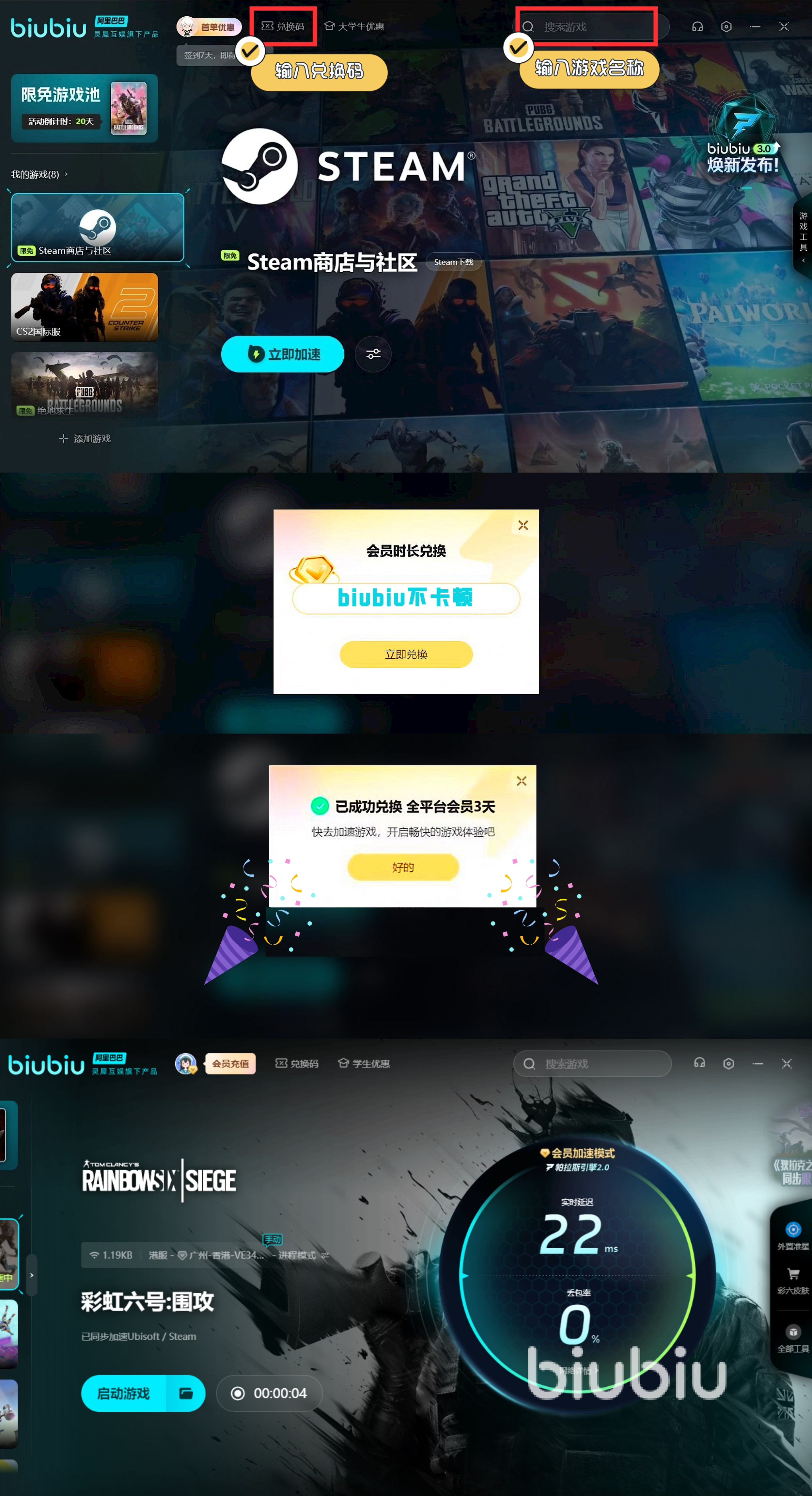 所以我們最好還是開啟biubiu,如此才能防患于未然,即便比賽再激烈也不會藍屏。新用戶的話,可獲得3小時的免費加速;另外新老用戶通過【biubiu不卡頓】,即可額外獲得三天免費加速。