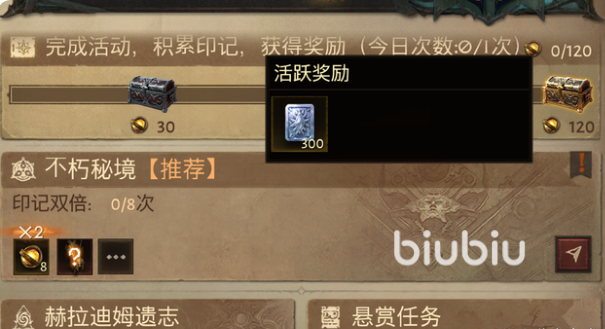 3、第一個(gè)搬磚點(diǎn)就是每天的保底任務(wù)了,這些是我們每天必須要做的,比如固定日常、懸賞等等,這些都可以按照你的時(shí)間安排,最后有固定的隊(duì)友一條龍來做,當(dāng)你全部完成就能獲得120點(diǎn)的先祖印記,就能獲得300白金幣了。