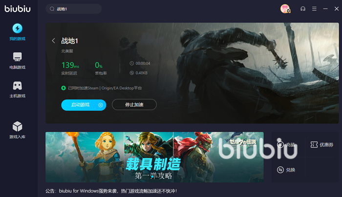 來(lái)源: 極光 作者: 白白 2023年05月29日 17:59這是一款以第一次世界大戰(zhàn)為背景從而進(jìn)行角色設(shè)定的射擊競(jìng)技類游戲,而且這一款游戲是以第一人稱的視角來(lái)呈現(xiàn)的。不少pc端競(jìng)技游戲都有延遲高、卡頓強(qiáng)等不給力因素,那么戰(zhàn)地1延遲高怎么解決你知道嗎?相信玩家們都知道,延遲高往往都跟自己的電腦性能以及網(wǎng)絡(luò)的傳輸速度相關(guān)。能夠安裝上這款游戲的電腦相信性能都不差,那么關(guān)鍵就在于這個(gè)網(wǎng)絡(luò)傳輸速度問(wèn)題。想要改善這個(gè)問(wèn)題,小編推薦使用biubiu加速器。