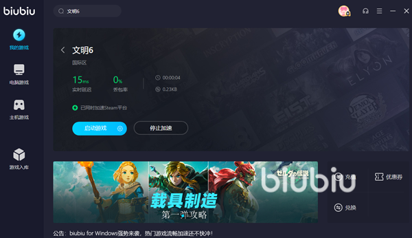 這款軟件對(duì)于游戲版本的支持也是很全面的,我們?cè)谲浖兴阉魑拿鲿?huì)發(fā)現(xiàn)除了六代之外,依然有玩家在游玩的五代作品也包含其中。而且文明6目前推出的四個(gè)平臺(tái)全部包括在內(nèi),主機(jī)平臺(tái)使用biubiu加速器還不用充值就可以直接使用。大家也可以進(jìn)入平臺(tái)的游戲庫(kù)中看看有沒有自己正在游玩的作品。