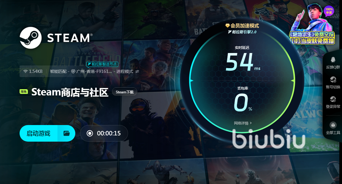Steam國區(qū)現(xiàn)在熱度很高,自身建設已經完善很多,隨著環(huán)境逐漸精華,引來了一大波新人入坑加入,現(xiàn)在steam國區(qū)玩家面臨最大問題,就是服務器緣故以及自身所導致一系列網絡問題。首先是商店登陸失敗,或者是下載過程中速度過慢,這些都很影響使用過程心情。為了解決這些問題,加速器就成為很必要工具,在選擇方面,biubiu是小編今天強烈推薦的加速工具,該軟件性能優(yōu)異,福利多。目前福利是新人注冊新賬號,能立即獲得24小時加速時間,這對于新人來說,絕對不容錯過。下面還有一項兌換碼一定要牢記,使用【biubiu不卡頓】,能直接獲得72小時會員時間,而且每個biubiu號都能兌換一次。