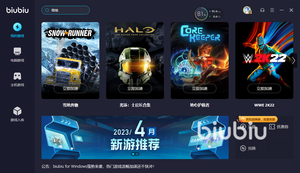 小伙伴們下載好雪地奔馳之后,不想去看平臺(tái)的解釋說(shuō)明的小伙伴可以跟著小編的路子學(xué)會(huì)怎么使用biubiu進(jìn)行雪地奔馳游戲加速,其實(shí)也不是多難的流程,biubiu的游戲加速非常簡(jiǎn)單,biubiu簡(jiǎn)化了一般游戲加速的復(fù)雜流程,只需要小伙伴們?cè)赽iubiu中找到雪地奔馳這個(gè)游戲添加到我的游戲之中,后面就可以在自己的游戲?qū)谶M(jìn)行游戲加速。