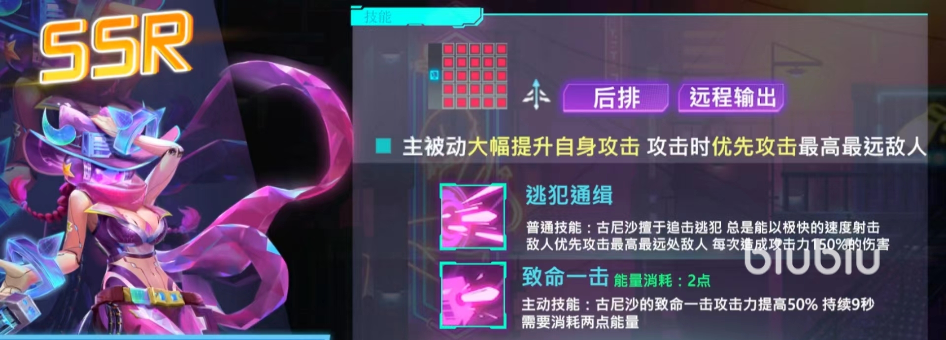 古尼沙的定位是輸出位的射手,其技能“逃犯通緝”除了加攻速、加傷害以外,自帶無限攻擊距離的機制,而攻速、傷害、攻擊距離的加成都非常契合古尼沙。并且這個技能還會讓古尼沙優(yōu)先選定最高最遠(yuǎn)的敵人,要知道常規(guī)的站位中最高最遠(yuǎn)的敵人一般都是對手的C位,相當(dāng)于古尼沙自帶自瞄。不過成也這個機制,敗也這個機制,古尼沙因為過于強勢很容易被對手針對,對手要是在后上方擺個坦克,古尼沙的輸出效率將大大折扣。