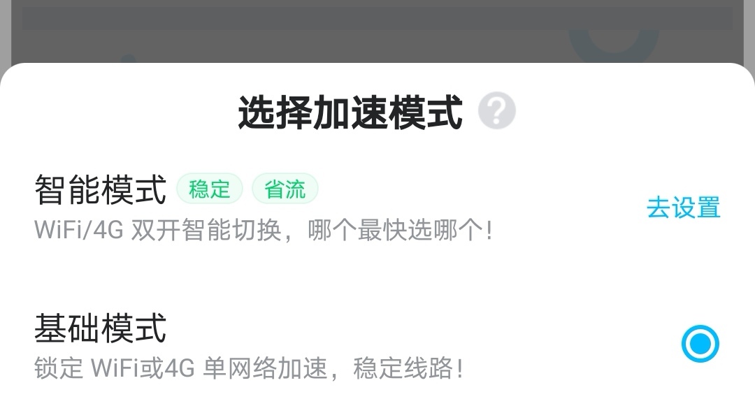 區(qū)別于市面上其他加速器,這款加速器操作界面非常簡潔,貼心設計了雙模式:基礎(chǔ)模式&智能模式,基礎(chǔ)模式會固定WiFi/流量單網(wǎng)絡加速,避免誤開流量產(chǎn)生大量費用;智能模式則是在WiFi和4G間動態(tài)切換,自動選擇更優(yōu)項確保流暢性。
