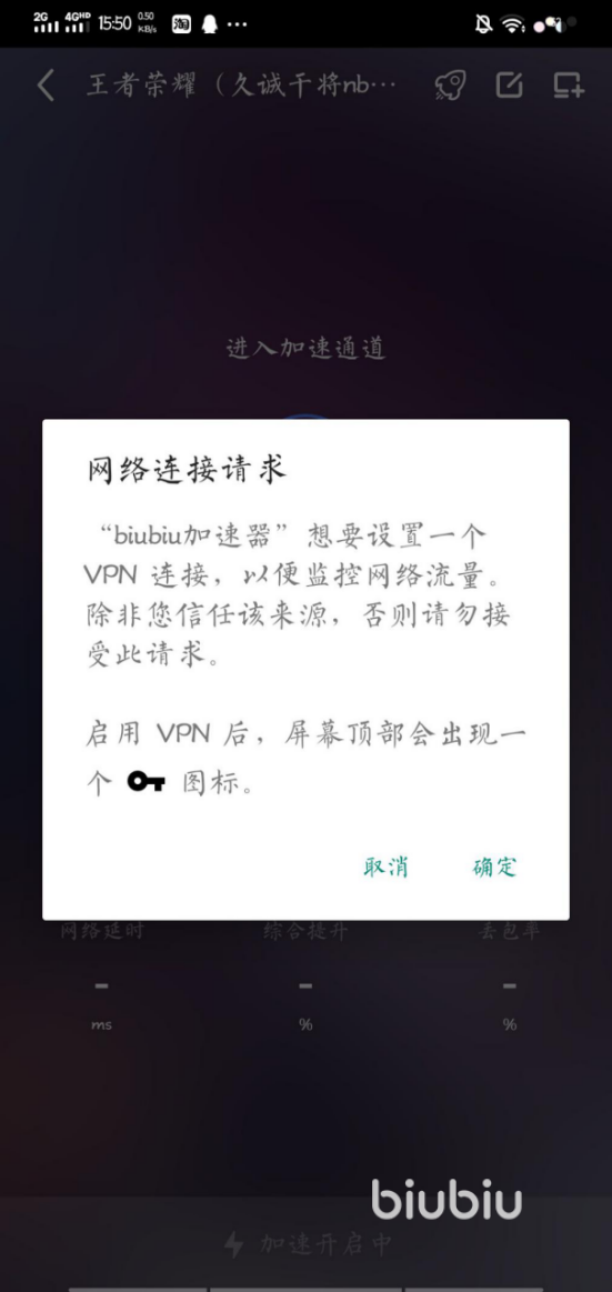 在初次使用biubiu加速器的時(shí)候,系統(tǒng)會(huì)提示大家打開(kāi)VPN連接,可以時(shí)刻監(jiān)控手機(jī)流量使用情況,防止流量使用過(guò)度。此時(shí)點(diǎn)擊確認(rèn)即可。