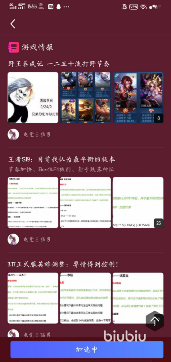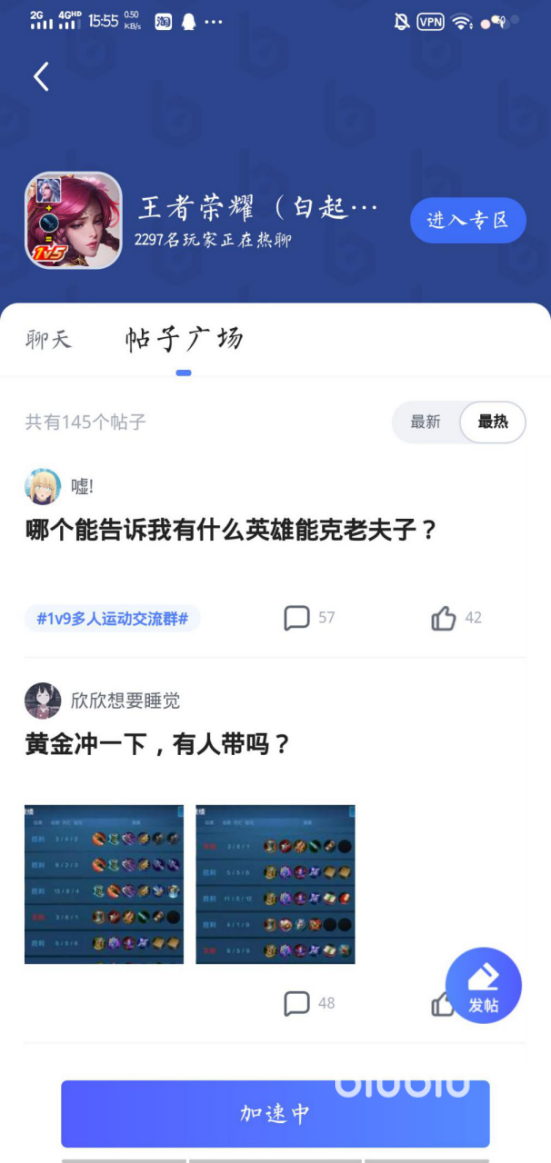 王者榮耀加速器專(zhuān)區(qū)除了能夠加速王者榮耀外,還有各種與王者相關(guān)的資訊以及攻略。點(diǎn)開(kāi)游戲頭像進(jìn)入“帖子廣場(chǎng)”和“游戲?qū)^(qū)”,與大佬一起交流,吐槽自己開(kāi)黑時(shí)遇到的一些問(wèn)題。還不趕快使用biubiu加速器運(yùn)行王者榮耀?感受最暢快的操作吧!