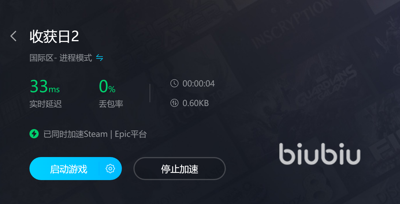 Biubiu加速的方式很簡單,和游戲二合一,小伙伴們只需要打開biubiu就可以啟動游戲,這個啟動會帶著biubiu給游戲運(yùn)行,一鍵開啟兩個軟件工作,非常方便。在簡便的同時,小伙伴們也可以看見在biubiu里收獲日2的加速效果是很棒的,狀態(tài)一直很穩(wěn)定,不僅可以幫助小伙伴們進(jìn)入游戲,還可以穩(wěn)定網(wǎng)絡(luò)狀態(tài),智能把控。