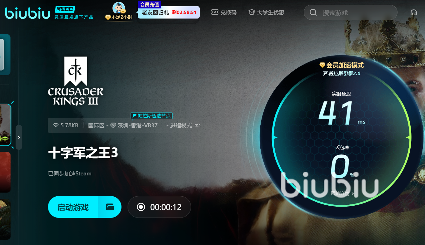 在使用biubiu加速器方面,即使是新用戶也可以很自然的上手使用,例如對(duì)十字軍之王3的游戲加速,可以直接在平臺(tái)找到已經(jīng)安裝的相應(yīng)版本的游戲,點(diǎn)擊加速按鈕就可以開啟網(wǎng)絡(luò)優(yōu)化,不僅能夠保障游戲過程中有持久的網(wǎng)絡(luò)狀態(tài),而且可以隨時(shí)停止網(wǎng)絡(luò)加速。