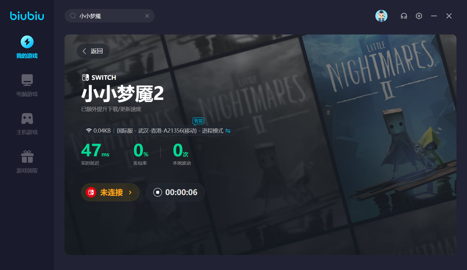 在使用biubiu加速器對小小夢魘這個(gè)游戲展開網(wǎng)絡(luò)加速的時(shí)候,如果用戶自己的設(shè)備上已經(jīng)安裝了這款游戲,則這款加速器就可以自動(dòng)檢測出來,只需一鍵點(diǎn)擊就可以開啟對網(wǎng)絡(luò)的優(yōu)化加速。而且對網(wǎng)絡(luò)的加速是隨用隨開,非常方便的。