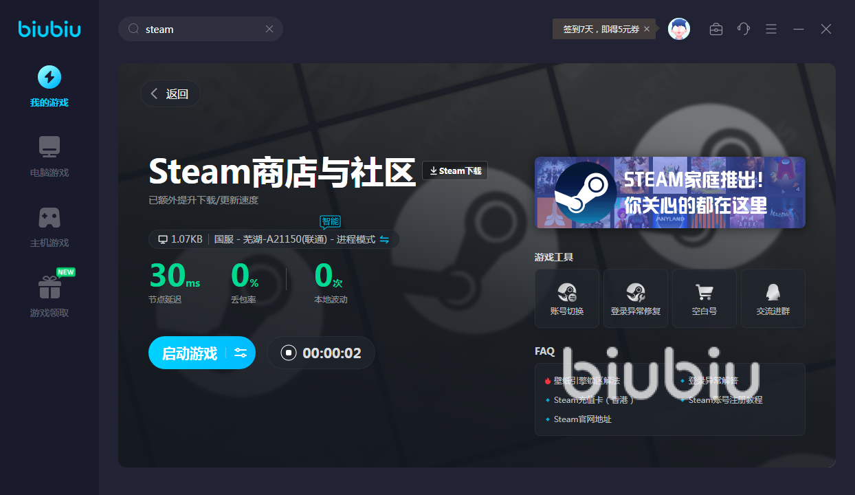 由于此游戲的核心玩法是開黑,所以如果要想游戲正常開始的話,那就得保證網(wǎng)絡(luò)環(huán)境沒(méi)有問(wèn)題,否則就會(huì)容易出現(xiàn)別人都進(jìn)游戲而你還卻還黑屏的情況,這個(gè)時(shí)候也不用著急只要使用biubiu加速器就可以解決問(wèn)題了,同時(shí)它還能加速對(duì)應(yīng)的steam平臺(tái)還是非常方便的。