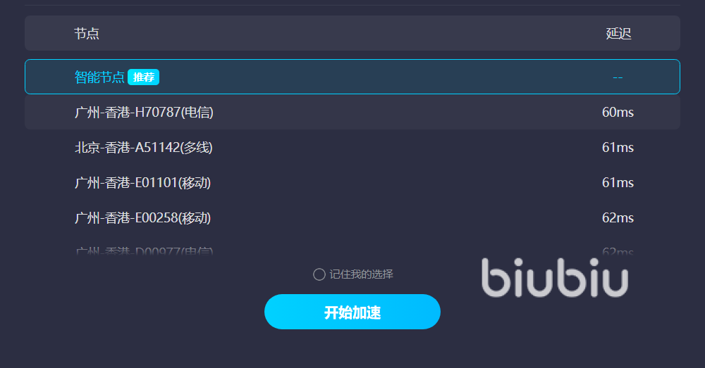 不管加載什么游戲都會讓大家去選擇區(qū)服,再根據(jù)你目前所在的位置智能匹配節(jié)點,當然也可以,你去自己手動操作選擇其他節(jié)點,實時監(jiān)控網(wǎng)絡(luò)動態(tài)信息,波動情況也會第一時間重連,重連的整個過程天衣無縫沒有一點破綻,不會說因為要重連網(wǎng)絡(luò)虛卡頓一下,這些現(xiàn)象在體驗biubiu加速器過程中都不會出現(xiàn),就這么一個靠譜且實用的軟件你還不快快下載體驗起來嗎?