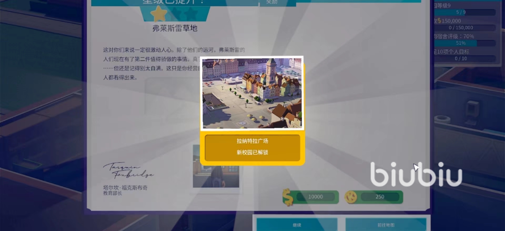 玩家等待一段時間后,等到購入的土地投入使用,就可以開啟下一學(xué)年了。本學(xué)年需要玩家把校園等級升到5級,讓學(xué)生的幸福感達(dá)到65%,期末完成新學(xué)科的教學(xué)任務(wù)就完成弗萊斯雷草地1星任務(wù),同時解鎖拉納特拉廣場。