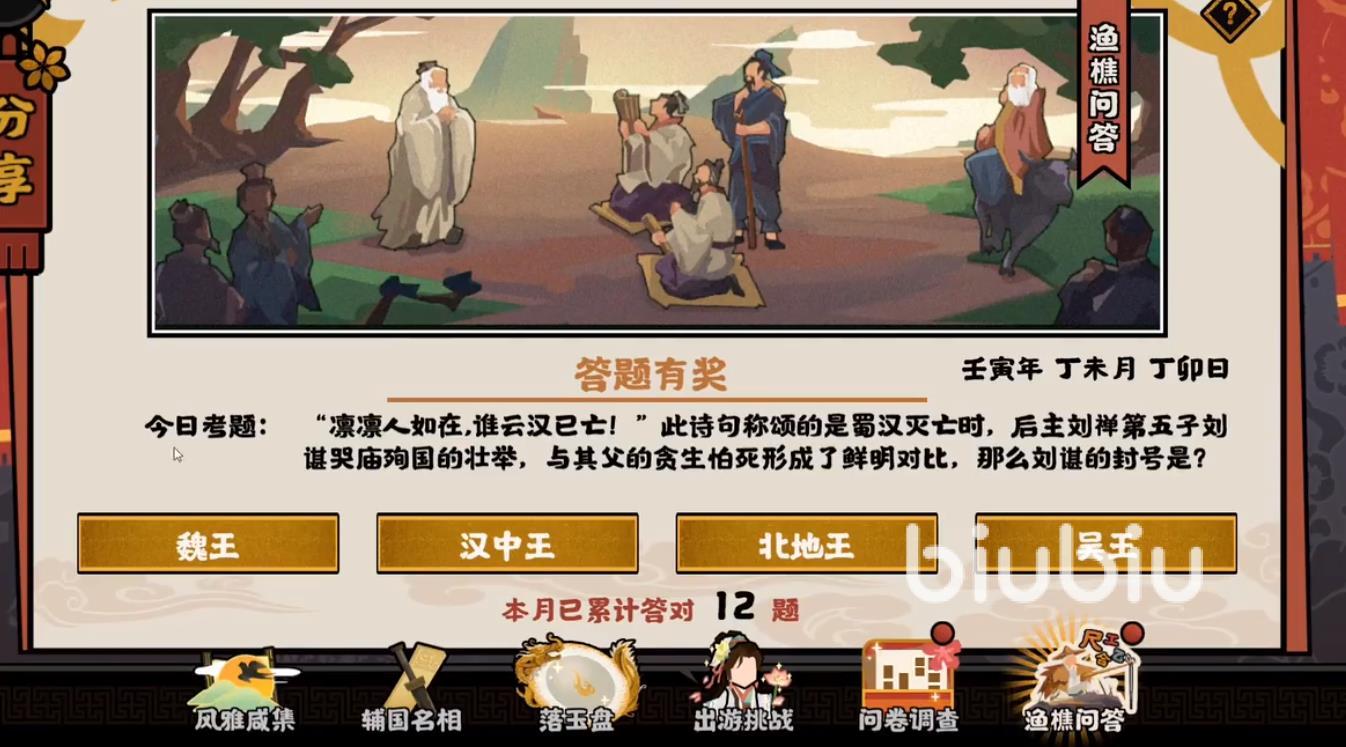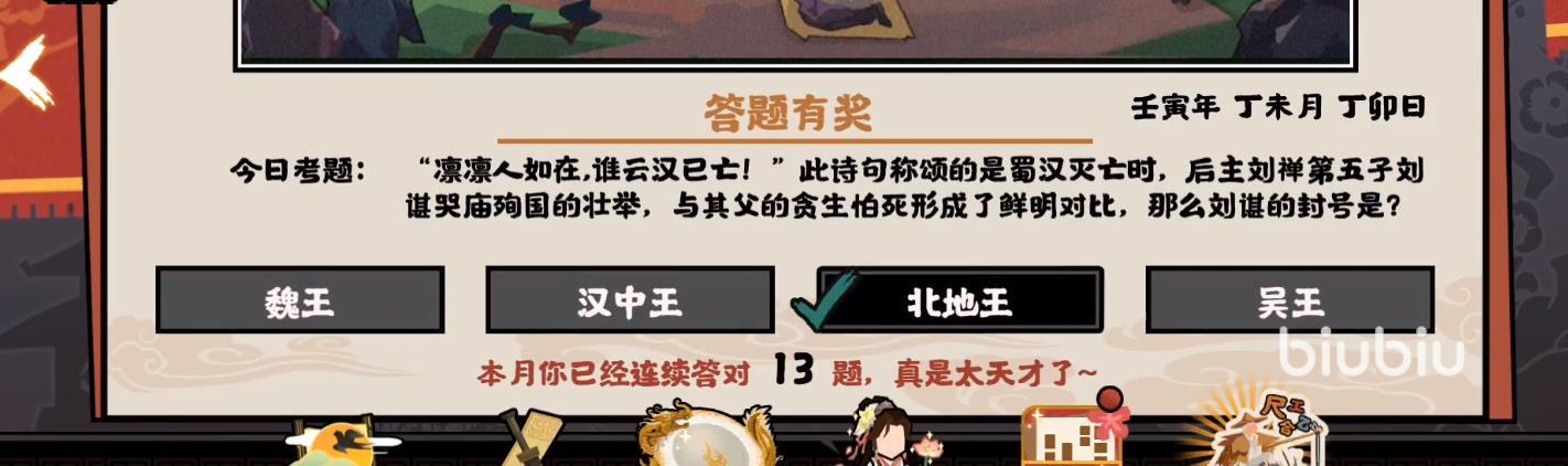 本次出題考的就是劉禪兒子的封號,可能一些小伙伴們對三國演義比較熟悉,而對于劉禪這位蜀漢的后主就不太熟悉了,更何況是他的第五個兒子呢,那么就來揭曉正確的答案了,就是——北地王,小伙伴們選擇第三個就對了哦!