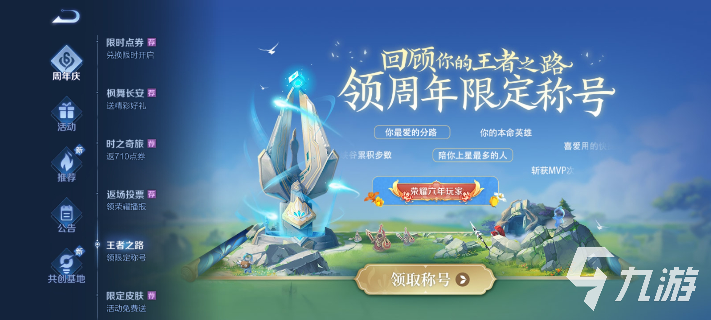 首先我們進(jìn)入王者榮耀——“活動(dòng)”——“周年慶”板塊,找到“王者之路”,在這里回憶起我們進(jìn)入王者榮耀游戲里的點(diǎn)點(diǎn)滴滴、陪伴我們戰(zhàn)斗的英雄、帶著我們上分的朋友——在瀏覽完畢動(dòng)畫之后,最后能得到一個(gè)六周年限定稱號(hào):“榮耀X年玩家(X是玩家當(dāng)前賬號(hào)的注冊(cè)時(shí)長(zhǎng))”以及【我邀請(qǐng)你】這個(gè)道具。