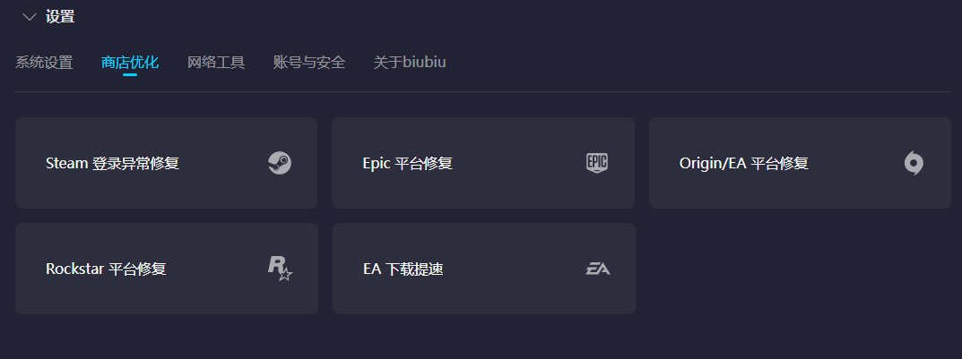 biubiu還給用戶提供工具箱來修復(fù)電腦網(wǎng)絡(luò)故障,當(dāng)大家覺得加速以后效果還是不明顯,或者經(jīng)常游戲登錄異常、網(wǎng)頁無法加載的時候都可以用工具箱來修復(fù)。它還能修復(fù)游戲商店登錄異常的情況,在系統(tǒng)設(shè)置里面可以找到這些工具。