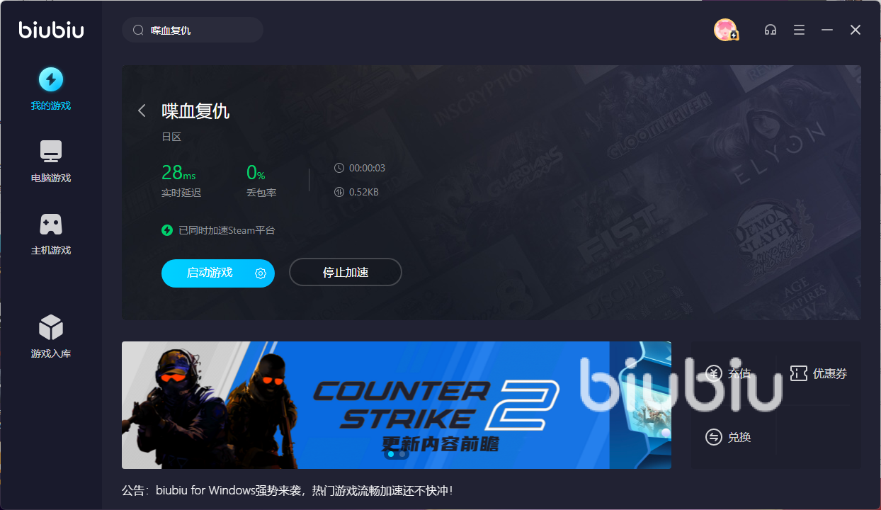 來源: 極光 作者: 果果 2023年04月14日 22:34喋血復(fù)仇作為一款生存對戰(zhàn)玩法的游戲,它的畫面制作除了逼真以外,射擊的還原度以及場景搭建都是很好的,所以很多朋友都喜歡,今天小編主要和大家說說喋血復(fù)仇卡頓掉幀怎么辦,畢竟很多玩家在下載游戲以后,登陸加載慢就算了,實(shí)際游戲體驗(yàn)的時候,還動不動就閃退,人物角色在畫面中卡死,怎么也動不了非常的難受,為此小伙伴們可以去使用biubiu加速器來幫助自己去解決網(wǎng)絡(luò)方面的延遲故障,重點(diǎn)是它還非常的穩(wěn)定。