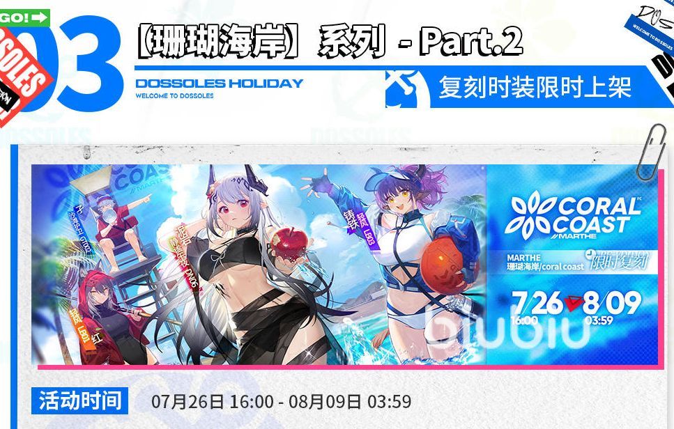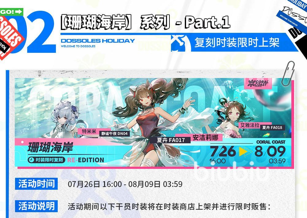 玩家們千呼百喚的珊瑚海岸系列復刻時裝在七夕節(jié)前后兩周的時間內限時上架,分別有珊瑚海岸系列艾雅法拉和安吉麗娜,還有特米米;另外還有泥巖、紅、鑄鐵、孑。