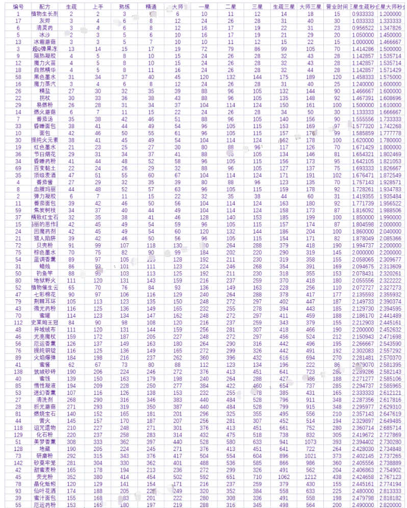 可以出售的煉金物品有150種研制產(chǎn)物和40種秘方產(chǎn)物。要篩選出高秒金的物品還是需要花費(fèi)一定的功夫進(jìn)行對(duì)比。同時(shí)煉金產(chǎn)物也是有門檻的,需要循序漸進(jìn)慢慢解鎖。所以可以在游戲前期先把有限的產(chǎn)物進(jìn)行對(duì)比選擇性價(jià)比高的進(jìn)行煉金出售??梢园褑蝹€(gè)產(chǎn)物的熟練度練上去,能明顯提高性價(jià)比。以下是秒金排行表。