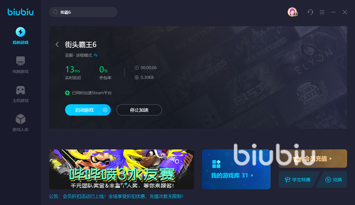 來源: 極光 作者: 秋水 2023年08月14日 17:39街霸6,全程街頭霸王6,是一款橫版格斗類型的游戲,有著非常華麗的技能特效以及非常熱血的戰(zhàn)斗場面,作為經(jīng)典格斗游戲系列——《街頭霸王》的扛鼎之作,是很多格斗迷玩家內(nèi)心的神作,加速街霸6什么加速器好則是很多在戰(zhàn)斗過程中感受到卡頓的朋友們想知道的,俗話說要想格斗好,加速器少不了,小編給大家推薦一款加速神器——biubiu加速器,一定能讓大家滿意!
