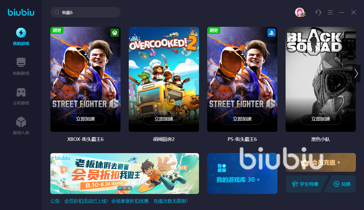 目前biubiu加速器只要新人來注冊,24小時加速時長免費雙手奉上!讓各位格斗迷們感受到真真切切的福利,并且如果大家喜歡玩別的游戲,在biubiu的游戲庫里也都可以找到,找不到直接右上角找客服,分分鐘幫大家安排!是不是很心動!