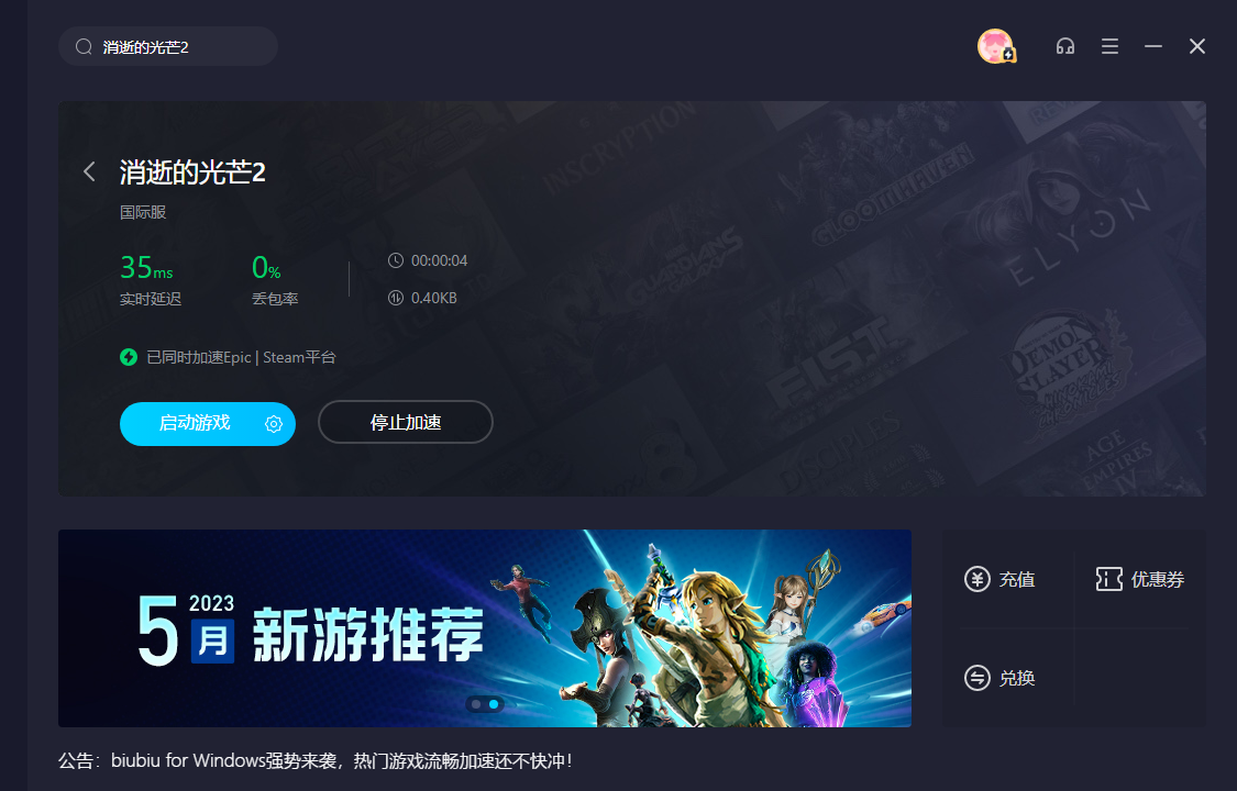 之后小伙伴們如何給biubiu給消逝的光芒2加速呢?小伙伴們要打開biubiu從biubiu然后啟動游戲就可以加速了。后面結束游戲的時候需要回到biubiu關閉一下游戲的加速狀態(tài),節(jié)省游戲的內存。