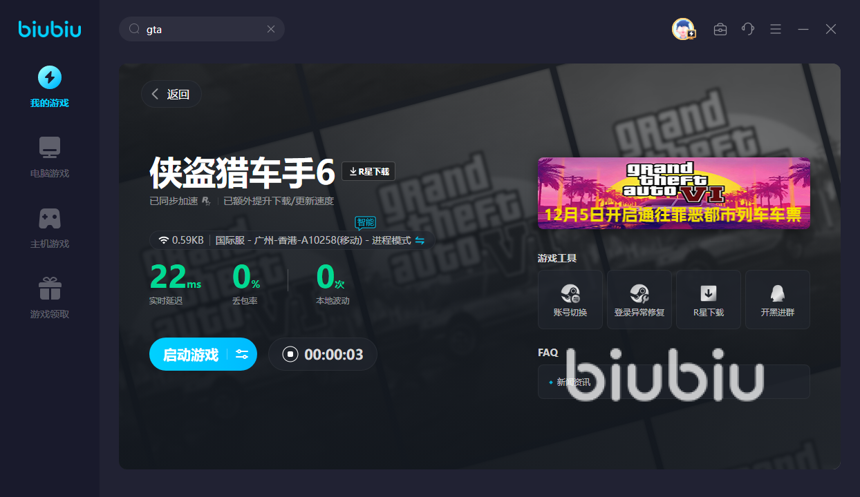 該游戲的線上玩法目前暫且沒有國服,所以為了進(jìn)入不同區(qū)服的網(wǎng)絡(luò)。還得開啟biubiu加速器,這樣方可連接上海外網(wǎng)絡(luò),讓你一鍵啟動(dòng),從此告別區(qū)域的限制,隨心所欲地出入不同gta的服務(wù)器。此外,gta與別人聯(lián)機(jī)的時(shí)候,太卡的話同樣會(huì)導(dǎo)致畫面卡住。還好biubiu優(yōu)化后的網(wǎng)速非常好,能夠更快地匹配對方。然后快速地聯(lián)絡(luò)對方,并且合力完成更多任務(wù)和操作,從此無需費(fèi)力!如果暫時(shí)想玩其他游戲的話,也可以輕松中止加速,然后為其他類型的游戲,例如pubg等游戲提速,操作起來非常簡單,無需不用受限于一個(gè)游戲的世界里。
