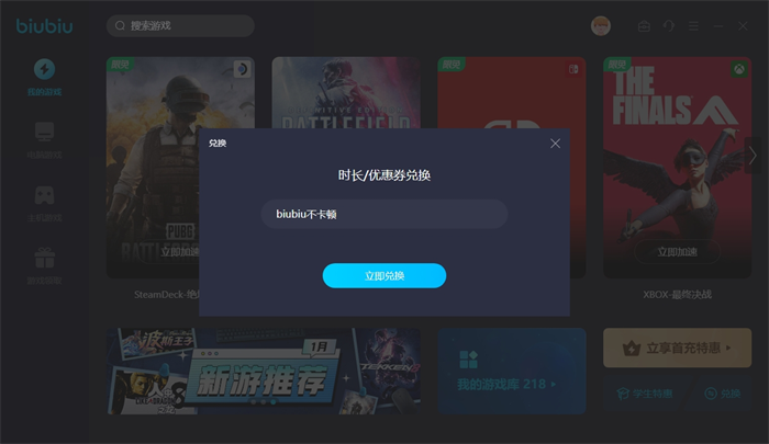 同時(shí)玩家作為新用戶的話,能夠在首頁(yè)去點(diǎn)擊兌換窗口,然后在其中去輸入【biubiu不卡頓】來(lái)幫助自己去額外的兌換3天加速時(shí)長(zhǎng),這點(diǎn)目前很多工具都無(wú)法做到,此外這一福利到時(shí)候老用戶也可去領(lǐng)取,針對(duì)各類(lèi)主機(jī)和PC游戲大家都能去開(kāi)啟加速哦。