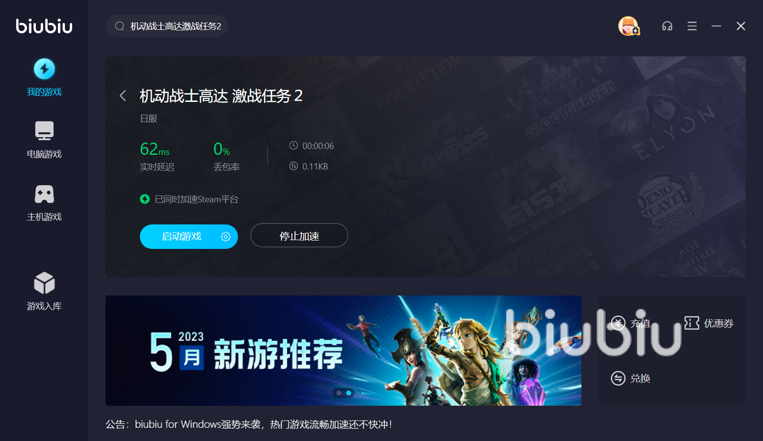 看完小編對于該軟件的介紹之后,現(xiàn)在大家知道機動戰(zhàn)士高達激戰(zhàn)任務2加速器哪個好了吧,biubiu作為端游和主機游戲等領(lǐng)域都很好用的加速軟件,支持目前市場上絕大多數(shù)正在運行的游戲,只要有加速需求就可以在這里實現(xiàn)。