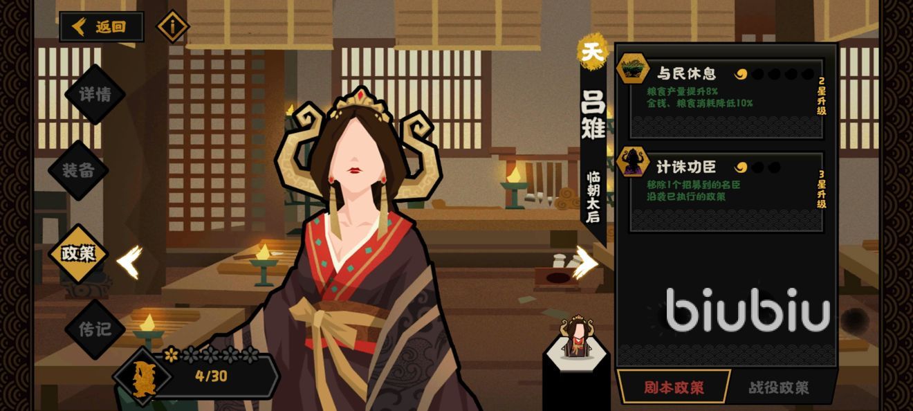 在此次的秦楚漢劇本里面,有四個(gè)角色是相當(dāng)亮眼的,第一個(gè)就是呂后了,也是歷史上相當(dāng)有名的一個(gè)女性人物了,她的出現(xiàn)則讓游戲里多出了一個(gè)新玩法,其技能簡(jiǎn)單一點(diǎn)來說,就是讓一個(gè)已有的角色下場(chǎng),不過對(duì)方的技能依舊有效,而這個(gè)空出來的位子就可以繼續(xù)招下一個(gè)人了,如果將該技能提升到最高等級(jí)的話,她最多可以讓三個(gè)人下去,也就是能繼續(xù)多招三個(gè)。